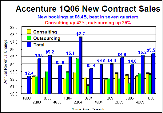 New Contracts. Accenture's new contract bookings totaled $5.5 billion, up 35% from the year before. It was the second-best showing in the company's history. Only the second quarter of 2004 had higher new contract sales. And it was a balanced growth. Within the $5.5 billion total, consulting accounted for $2.78 billion, up 42% from the year earlier, while outsourcing was $2.76 billion, up 29% from the corresponding period in fiscal year 2005. Given the above sales results, "we feel confident that we are on the right trajectory to achieve our revenue goal for the year," said Green, the CEO, in a statement. "The global demand for consulting and outsourcing is strong," he added in a conference call that followed the earnings release. He also said that competitive pricing pressures are easing, helping improve the gross profit margins of the new deals. "We are feeling more optimistic about pricing than we have for a very, very long time," he said. Despite its outstanding results in the last two quarters, Accenture executives continue to offer relatively conservative guidance for the rest of the year. For the full fiscal year 2006, for example, they expect the revenue growth of 9% to 12% in local currency (which could be less "as reported" if the dollar continues to rise). As for the earnings per share, the company expects the full fiscal year EPS to be 19% to 23% higher than the comparable FY05 figure ($1.28 per share). This new range ($1.52 to $1.57 per share) would put the FY06 earnings at the mid- to high-end of the Wall Street estimates (averaging $1.52 per share). Previously, Accenture guidance was $1.45 to $1.50 per share. This increase guidance means the stock may continue to rise for a while as analysts adjust their forecasts upward. Two years ago, Accenture's second fiscal quarter marked the start of its nascent ascent (see "Burning the Track Again," Mar 2004). That's when the company set its all-time sales record with new bookings of $7.7 billion. Will the second quarter of FY06 be an encore? Certainly the opportunity is there. It is more important from the shareholder standpoint, however, for the company to continue its profitable growth. With operating margins in the 13% range, Accenture is already in the record territory compared to its major rivals. And that's the kind of performance that will continue to earn it the name Excellenture. Happy bargain hunting! Bob Djurdjevic For additional Annex Research reports, check out... Annex