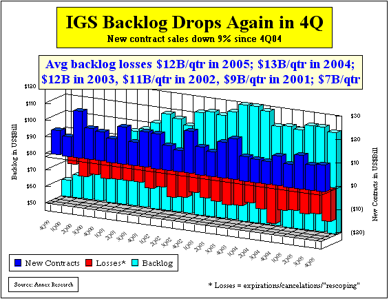 In 2005, the backlog outflow (the red bars above), including the rescoping, averaged $12 billion per quarter. No wonder backlog was down in the fourth quarter, and so was the IBM Global Services revenue. Fujitsu Swings to Profit in Third Fiscal Quarter SCOTTSDALE, Jan 31 - Fujitsu swung to profit in the third quarter of its fiscal year 2006, earlier than expected. Net profit totaled 3.4 billion yen ($29 million) in the October-December quarter, up from a loss of 9.6 billion yen in the same period a year earlier, the company reported today.