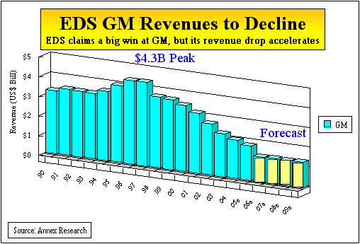 Indeed, EDS appeared to have won the biggest chunk of GM contracts relative to other competitors. But this new level of EDS' annual business means that the company will have lost over two-thirds of its GM revenues since 1997, when they peaked at $4.3 billion. (In 2004, they were about $2 billion. We estimate that the 2005 GM revenues will come in under $1.8 billion, when the company releases its fourth quarter results next week). If there was a sigh of relief emanating from EDS's Plano, Texas, headquarters, it was probably because the company could have lost more business. Preserving about $1.3 billion of average annual revenues over the next five years seems to us more like stemming the hemorrhaging than a victory. Yet "a penny saved is a penny earned," as they say. EDS' "victory" at GM once again illustrates the advantages an incumbent has in the IT services business. It knows better than anybody else where the skeletons are. So who was actually the biggest winner today? Well, Capgemini seems to have earned that honor. The Paris-based company expanded its current contract with GM from $75 million to $500 million. Capgemini won all six contracts it bid on. The Bangalore, India-based Wipro also multiplied its business - from $35 million in 2005, to $300 million. Among other big hitters in the IT services field, HP Services won more business than IBM ($700 million vs. $500 million). And Covisint, a subsidiary of Detroit-based Compuware Corp., was also awarded a contract but didn't reveal the amount. Starting 2004, GM broke up its IT work into 40 segments and then solicited open market bids. GM said it would name other winners toward the end of the year, when its telecommunications contracts expire. Happy bargain hunting! Bob Djurdjevic For additional Annex Research reports, check out... Annex