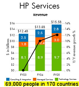 Indeed, Managed Services, of which infrastructure outsourcing represent some 90% of business, has been a rapidly growing part of HPS (see the above revenue chart).  It accounted for $3 billion of the $15.5 billion revenues that HPS recorded in FY2005 (ended Oct 31).