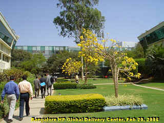 And most of them are based in Bangalore.  HP's beautiful campus where its Global Delivery Center is located looks as pretty and sophisticated as any top-flight high-tech operation in Silicon Valley or elsewhre in the U.S. (see the photo on the right).  Unlike other western companies, however, HP has also won outsourcing contracts within India (see "A Passage from India," Mar 2004).  Which means that the Bangalore center is used to support domestic Indian customers, such as the Bank of India, and not just those from the U.S. or elsewhere in overseas countries.
