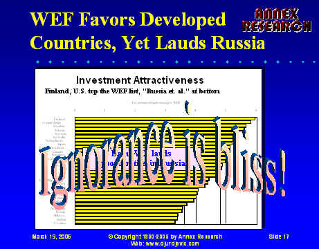 For the next 10 years or so, western investors largely ignored this gold mine of economic and human assets. Even as late as September 2005, prestigious global economic organizations, such as the Geneva-based World Economic Forum, (see "New 'Drang Nach Osten'," Sep 2005). While paying lip service to Russia's economic potential, they favored the Old Europe in their investment recommendations.