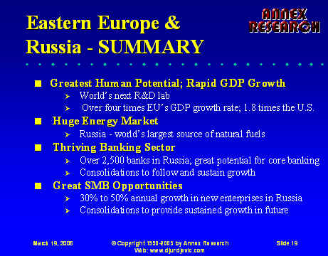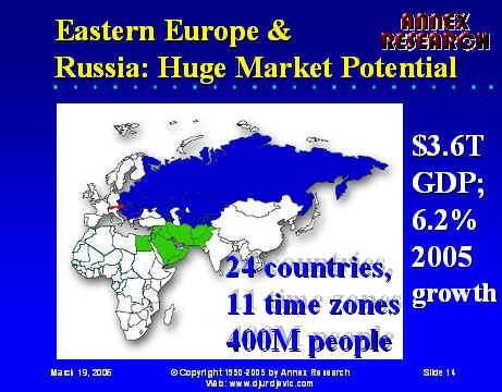 We said contemporaneously such opinions, best described under the "Ignorance is bliss!"-label, are based on old Cold War biases, and are thus worthless in today's economic environment. We reconfirmed such a conclusion a month later in our own analysis of global investment opportunities (see "Yin-Yang Pacific Tsunamis," Oct 2005). And now, after this writer's latest whirlwind tour of Eastern Europe and Russia, we can tell you with reasonable certainty that those who continue to ignore this vast market will be doing it at their peril...