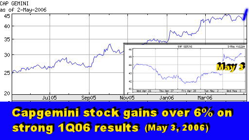 As a result, the company lifted its revenue growth outlook for the year to 8% from 6%. Capgemini maintained its operating margin target of 5% for 2006, according to Nicolas Dufourcq, the CFO. This can be considered a conservative move considering the improved profitability of many of its business operations. The stock market certainly seemed to think so as investors and traders boosted the price of Capgemini shares by over 6% today, following the release of its first quarter results. As you can see from the above chart, the stock has been on a steady upward march since October 2004 during which its share prices have more than doubled.