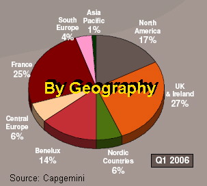 Capgemini, in a post-release teleconference with Indeed, the two largest European operations - France and U.K./Ireland - also reported the highest growth rates, up 16% and 15% respectively. Most of the rest of European regions grew in the 11% to 12% range, while Italy declined 14%. As for Capgemini's North American operations, long its "problem child," revenues in consulting and technology services, and the local professional services, increased 6% and 4% respectively, while the outsourcing revenues declined 13% year-over-year. But the latter was deliberate shrinkage initiated by the company. Capgemini has canceled some unprofitable contracts in the hope of improving the quality of its revenues and earnings in the future. But perhaps the best news from the North American operations is its new bookings. At €768 million ($971 million), they are up 271% since a year ago, and 256% sequentially (from the fourth quarter). Again, it is not just the quantity, but the quality of new deals that is encouraging. Apart from the GM megadeal, most of the rest comes from the more profitable midsize-type businesses. Local professional services bookings jumped by 43%, while consulting and technology services deal values surged by 27%. "The restructuring in the U.S. is now complete," Cros declared during this morning's teleconference. The company said revenues from local