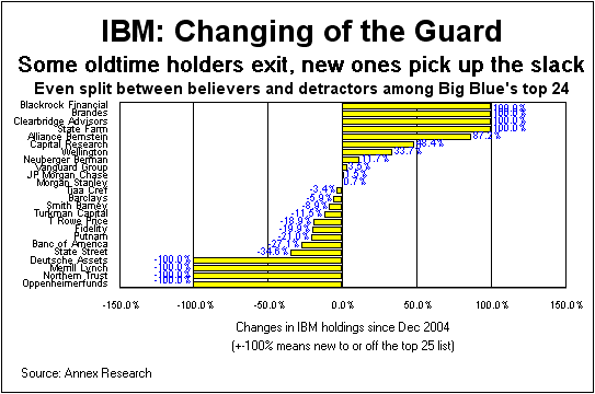 But Merrill was not alone to desert Armonk. Deutsche Assets, Northern Trust and Oppenheimer, among some prominent Wall Street firms that have been longtime big IBM fans, have also exited the list of top 25 shareholders. In fact, net sellers outnumbered net IBM buyers among the institutional holders by 701 to 453 in the quarter that ended Sep 30 (see IBM table). But, "one man's trash is another man's treasure," they say. Blackrock Financial, Brandes, Clearbridge Advisors and State Farm, among others, have picked up the slack. And then some. The new buyers as a group were more aggressive than the sellers. As a result, the new IBM stock acquisitions outpaced the sold-out positions by 3.6 million shares (see IBM table).