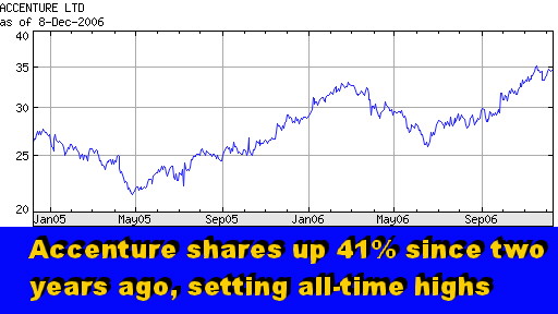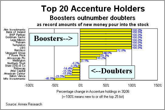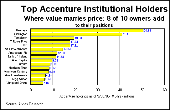 Obviously, such a stock performance has given some major HP institutional shareholders a chance to take profits and get out, or to substantially reduce their holdings. Banc of America, Brandes, Merrill Lynch, Putnam, T Rowe Price were some of them. The HP boardroom crises that became big headline news in September, may have also played a (small) part (see "New King of the Hill," Nov 2006). But others may have seen that as a buying opportunity. Goldman Sachs, JP Morgan Chase, BNP Paribas, Blackrock Financial, Legg Mason, Wellington... were among the institutions that have substantially added to their HP positions. Overall, however, the net institutional sellers outnumbered the buyers by 539 to 433 in the quarter that ended in September. And the sold-out positions also exceeded the new buyers' stock by 188 million to 171 million shares (see HP table). Nevertheless, the HP stock has maintained its upward momentum since then, perhaps leaving the net sellers wondering if they had exited too soon? Accenture: Value Marries Price, Shares Setting All-time Highs It does not happen often these days on Wall Street that value marries price. Accenture is one such exception. The company that is regarded even by most of its peers as the "best of breed" in the global IT services market, is also treated as an "MVP" (Most Valuable Player) by the stock market. Accenture's shares are up 41% since two years ago, trading near its all-time high of $35, set last month. And its shareholders seem to know a good thing when they own one.