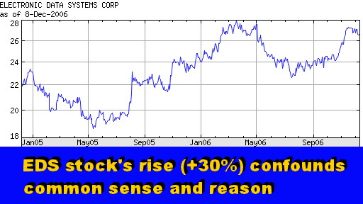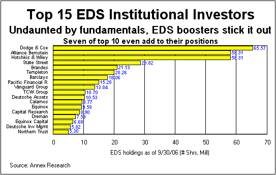Aim Investments, Bank of Ireland, BNP Paribas, Goldman Sachs, Legg Mason, Putnam Investments, Templeton, UBS... are among the institutions that have contributed to the record amounts of new money that has poured into the Accenture stock. Together with the longtime holders that have also boosted their positions, such as Barclays, Vanguard Group, T Rowe Price and Amvescap, for example, these Wall Street firms are ensuring that value stays married to price in Accenture's case. EDS, the "Titanium Stock", Continues to Confound, Defy Common Sense, Reason By contrast to Accenture, the EDS stock is the epitome of divergence between value and price. As we have been saying for years, EDS shares have continued to confound common sense and reason. For a while it seemed that the company could do no wrong. The worse the news got, the better the stock did (see “EDS: The Titanium Stock,” Dec 2004 and "EDS: A $6 to $9 Stock?," Feb 2005). That was because the company has the highest institutional shareholding percentage of any company we follow (93% - see EDS table). And Wall Street certainly knows how to cover its tracks and protect its positions. , EDS Since that time, the EDS performance in the global IT services marketplace has improved somewhat, but still hardly enough to warrant a 30% jump in its stock market prices since two years ago. Here's what we said about its fundamentals earlier this year: