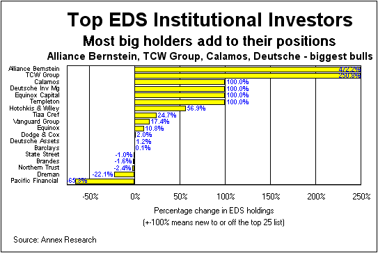 Undaunted by the company's underwhelming fundamentals, top EDS institutional shareholders continued to hang on to their holdings, some even adding to their positions. In fact, even of the top 10 holders boosted their EDS positions since two years ago.
