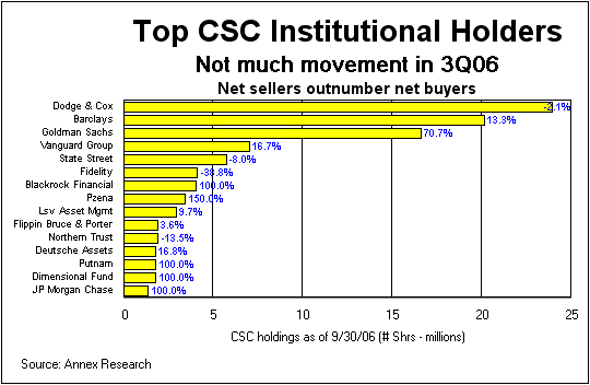 The top CSC institutional shareholders have been remarkably steady through all this turmoil. That is not surprising, considering that CSC is the second most highly held stock, with 91% institutional ownership share (after EDS' 93% share). Sure, there have been departures from the top 25 list, and newcomers to it, as you can see from the above chart. But overall, the net sellers and the net buyers were fairly well balanced.