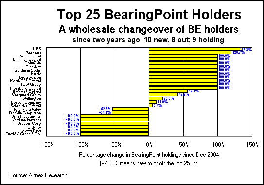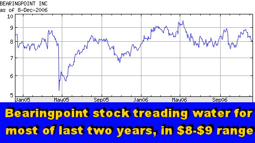 In the third quarter, for example, the net sellers of CSC shares outnumbered the net buyers by 255 to 163. But the net positions change was only 1.5 million shares (in favor of sellers), out of some 157 million shares owned by the institutions (see CSC table). BearingPoint: Resilience in the Face of Adversity For most of the last two years, BearingPoint shares were treading water, trading in the $8 to $9 range. The stock was as high as $9.6 and as low as $7.4 in the last 12 months, finishing last week down 5% from Dec 6, 2004. Operating without the published and audited financials for much of the last two years, investors have had to make their bets basically on their hunches and the reputation of Harry You, a former Wall Street executive, whom the company brought on board as CEO in March 2005 (see "Where You-turn Means Upturn," May 2006). Under the circumstances, we think it is absolutely remarkable that the BearingPoint stock has shown such resilience in the face of adversity.
