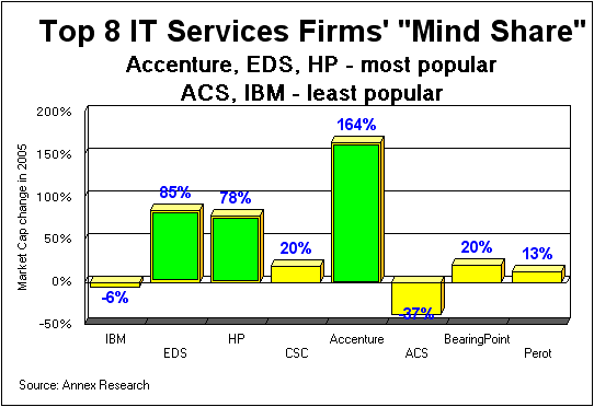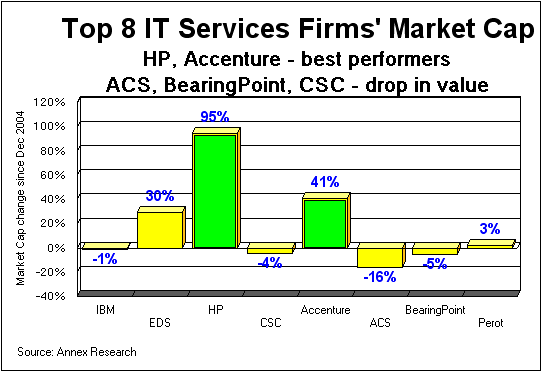 Overall, the market caps of the top 8 IT firms have risen by 25% since two years ago. Interestingly, only three companies (HP, Accenture, EDS) actually experienced double-digit increases. ACS was the only one with a double-digit decline.