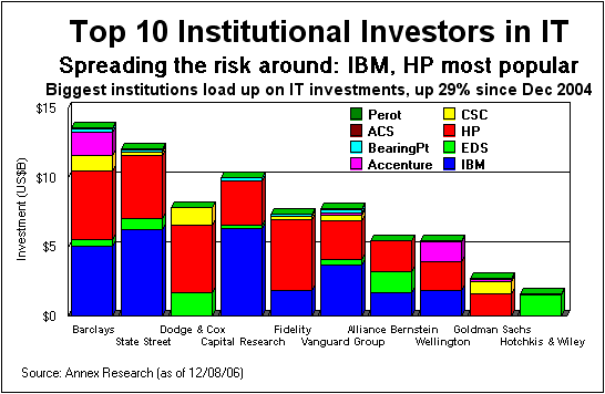 Finally, hedging the bets as what Wall Street institutions do well. Notwithstanding the differences in fundamentals of the top 8 IT firms covered in this report, the top 10 Wall Street investors in high tech own a little bit of most of them. So Barclays, for example, the biggest high tech player on Wall Street nowadays with $13.6 billion invested in the top 8, has placed $5 billion bets each on IBM and HP each, followed by $1.7 billion on Accenture, $1.1 billion on CSC, and half a billion dollars on EDS. In fact, Barclays owns a piece of each of the top 8. Talk about covering all bases! Similarly, State Street, the No. 2 technology player, has its biggest bets on IBM and HP, with smattering of other investments in EDS, CSC, ACS and Perot. Merrill Lynch, on the other hand, No. 9 among the top 10 Wall Street players two years ago, with $1.4 in top 8 high tech investments, is nowhere to be seen, replaced by Goldman Sachs' $2.8 billion+ IT portfolio. And so on... the top 10 Wall Street institutions' investments in the top 8 leading IT firms has jumped by 29% since December 2004 to $74 billion (see Top 10 Summary). As you can see, you don't have to be a hedge fund to hedge your bets. The biggest Wall Street players are doing it day in and day out. It's only the suckers hope to win by making individual bets. Good luck to them!