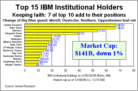 Analysis of Institutional Shareholdings of Top 8 U.S. IT Services Companies Hedging the Bets Four Major IBM Institutional Holders Exit the Stock, But New Believers Pick Up the Slack and Then Some HP Stock Nearly Doubles, Some Major Holders Exit, Taking Profits Accenture: Value Marries Price, Shares Setting All-time Highs EDS, the "Titanium Stock", Continues to Confound, Defy Common Sense, Reason BearingPoint: Resilience in the Face of Adversity Major ACS Owners Bail Out amid Options Scandal Perot Systems Shares at New Multi-year Highs SCOTTSDALE, Dec 11 - For decades, this Wall Street institution has been a stalwart Big Blue supporter. Through thick and thin; through feast and famine; through triumphs and foibles of IBM's able and feeble leaders, this Wall Street institution stuck it out with the company that the Watson's built. Well, no longer. Merrill Lynch is out. No longer among the top 10 IBM institutional shareholders, not even among the top 25, Merrill has been watching the recent rise of the Big Blue shares from the sidelines. And probably gritting its teeth... For, IBM shares are up