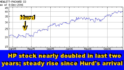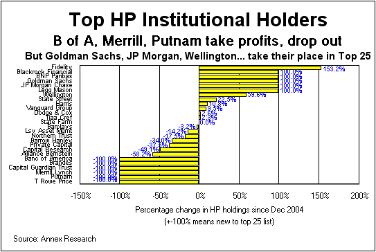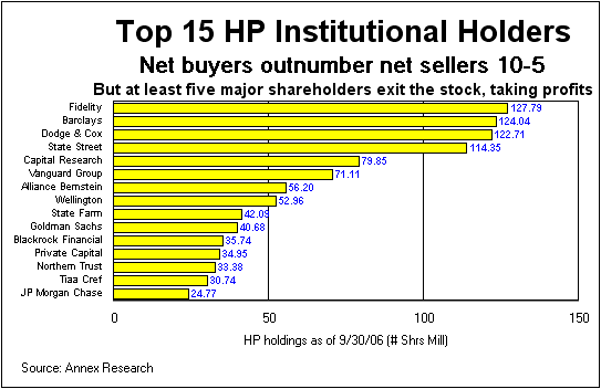 In fact, seven of the top 10 IBM institutional shareholders have added to their positions since two years ago. So it looks like "doubting Thomas's" like Merrill et. al. are being gradually outvoted. And if the IBM stock continues to climb the charts, as we expect it to, there will be more opportunities for its former owners to grit their teeth in frustration. Provided, of course, they have any teeth left. But they may have an ax to grind - for abandoning the Big Blue ship so early. HP Stock Nearly Doubles, Some Major Holders Exit, Taking Profits By contrast to IBM's, the HP stock has nearly doubled in the last two years (up 95% to just under $40 per share - see the chart). This means that the HP stock has outperformed the Dow, of which it is a part, by nearly six-fold during the same time frame, despite a record overall market surge. And most of this gain came since Mark Hurd took over as CEO in April 2005.