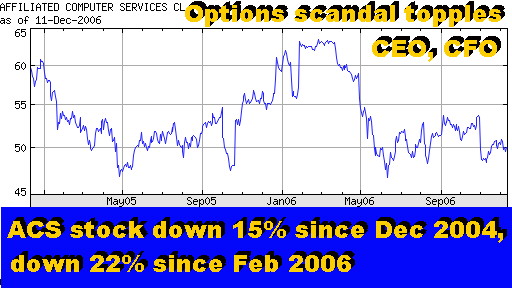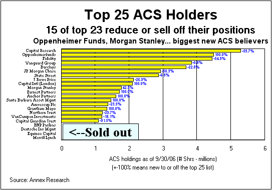 But operating on faith and hunches is not everyone's favorite style of investing. No wonder, therefore, that there has been a wholesale changeover of BearingPoint institutional shareholders in the last two years. Only nine of top 27 institutions from Dec 2004 were still among the top 25 as of Sep 30, 2006. The biggest among the institutions that have kept the faith and have boosted their BearingPoint positions were UBS, Barclays, Vanguard Group and Wellington. The newcomers included the Wall Street powerhouse Goldman Sachs, as well as smaller institutional investors, such as Thornburg and Glenview. But the biggest new bet was made by Ariel Capital, which is now the top shareholder of BearingPoint with 29 million shares. Overall, net buyers outnumbered the net sellers by 96 to 83. The new positions exceeded the sold-out positions by 2.85 million shares (see BearingPoint table). Major ACS Owners Bail Out amid Options Scandal SCOTTSDALE, Dec 12 - By the time ACS closed its barn door on the options scandal on Nov 27, announcing that its CEO and CFO had resigned, many of its major institutional holders had already bailed out.
