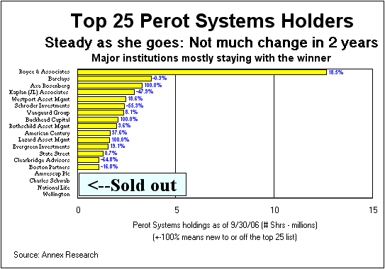 Attitudes of the major institutional Perot Systems' shareholders reflect that, too. There has not been much change among the top holders, as most institutions chose to hang on to the winner. In the third quarter, for example, the buyers and the sellers were fairly balanced - 5.5 million shares bought versus 5.3 million shares sold. Buyers also outnumbered the sellers by 77 to 70. "Steady as she goes," seems to be the Perot Systems modus operandi. As may be fairly obvious by now from the preceding analyses, the HP stock was by far the best performer among the top 8 IT services firms whose institutional shareholdings we have analyzed. It was followed by Accenture and EDS, in that order. The cellar was reserved for ACS and BearingPoint. No surprise there, as each company has had its share of troubles in the last two years. Ironically, the two are joined in the cellar by IBM, a company that has reported enviable fundamentals lately. Which is another illustration of just how much the Big Blue shares are still undervalued. And how unforgiving the marketplace has been to IBM for having missed its first quarter 2005 numbers by such a wide margin (see "Slammed and Dunked," Apr 2005 and "IBM Stock Grossly Undervalued," July 2006).