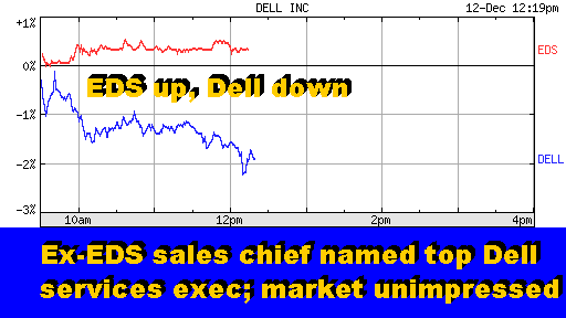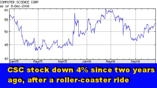Alliance Bernstein, TCW Group, Calamos, Deutsche Investments, Equinox, Templeton and Hotchkis & Wiley were among the biggest EDS boosters. Of course, there were some detractors or profit takers, too. Pacific Financial, Capital Research, Lord Abbett and (again) Merrill Lynch, for example, dropped from the top 25 list. And some smaller institutions also chose to head for the door. Overall, sellers outnumbered the buyers of the EDS stock in the third quarter by 190 to 172. And the sold-out positions exceeded the new ones by 47 million shares to 27 million shares. But then, the bulls seemed to have kicked in again in the fourth quarter, probably from among the existing 93% institutional holders, defending their positions, and pushing the EDS price at close to its two-year high of $28 per share. Ex-EDS Sales Chief Named Top Dell Services Exec: Market Unimpressed SCOTTSDALE, Dec 12 - Dell has tapped the former EDS sales chief to lead the computer maker's global services organization. As senior vice president of global services, Steve Schuckenbrock will report to CEO Kevin Rollins and serve as a member of the Dell Global Executive Management Committee. He will begin work with Dell on Jan. 8. But the markets were unimpressed by the news. EDS stock was actually up 0.4% this morning, while Dell's dropped 1.8%. We think such a reaction was erroneous on both counts. Schuckenbrock had previously served as COO and EVP of global sales and services for EDS. He left EDS in May of this year, after being squeezed out by Ron Rittenmeyer, whom EDS promoted a week ago to President. Before joining EDS in 2003, Schuckenbrock was COO of consulting firm The Feld Group, which EDS acquired nearly three years ago (see "EDS Buys Feld Group," Jan 2004). While at EDS, Schuckenbrock was well thought of by his peers and subordinates, by contrast to Rittenmeyer, who was evidently Michael Jordan's (chairman) favorite. An EDS insider described Rittenmeyer last May as "a junior Dick Brown. Good I/T knowledge, zero outsourcing knowledge, and completely full of himself." By contrast, "Schuckenbrock was well thought of and had been steadily rounding out his outsourcing knowledge. Rittenmeyer over-shadowed him with bombastic BS." "In short, heads dropped (at EDS) with this announcement" (of Schuckenbrock's leaving the company, and Rittenmeyer taking over), this person summed it up. Well, one main's loss is another man's gain. To us, it looks like Dell has gained a good man. But judging by this morning's market reaction, it may take a while for Wall Street to come around to seeing it that way, too. The CSC stock has been on a roller-coaster ride in the last two years. It went down steeply in the first half of 2005, bottomed out by late summer, and rose to a five-year high of $60 in the spring of this year. Then a series of disappointing announcements drove the CSC shares down into the $40s by late August (see "Up for Grabs," May 2006 and "Ebb Time Lowers Most Boats," Aug 2006). The stock has since recovered some of its luster, but it is still down 4% compared to the level two years ago.