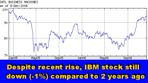 about 30% since their nadir on July 18. And even But the IBM stock is still down 1% from two years ago. As you can see from the above chart, the Big Blue shares have not really fully recovered fully from the Apr 15, 2005 shockwave that sent institutional shareholders scrambling like mice before a cat (see "Slammed and Dunked," Apr 2005). Which means that IBM shares are still relatively depressed compared to some major competitors' stocks that more fully participated in record Wall Street market highs (see "IBM: A $125 Stock?", Nov 2006). More grit for Merrill's mill.