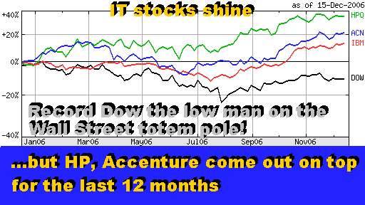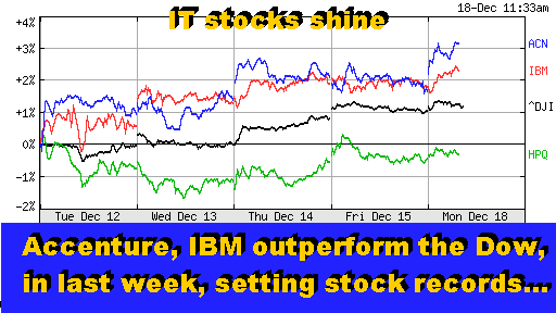 bargain hunting Bob Djurdjevic Market Update: Up, Up and Away IT Companies Lead the Market Surge; Accenture, IBM on Top; Record Dow: Low Man on Totem Pole SCOTTSDALE, Dec 18 - Major IT companies are leading the latest market surge. How do we know it? Take a look at the charts... Accenture and IBM, for example, which rose again this morning to new record highs, are exceeding the record highs that the Dow is also setting. In fact, all three are higher than HP, the top IT stock in the last 18 months in terms of stock market performance. For the year, however, HP is looking on top. So Accenture and IBM are now only catching up to HP's earlier gains. Meanwhile, the record Dow, of which both IBM and HP are a part, is still the low man on the Wall Street totem pole. A broader view of major IT stocks shows similar trends. All but two (Intel and Dell) have outperformed the record Dow in the last 12 months. Clearly, the IT stocks are leading the stock market surge. Funny you don't see much about that in the financial press...