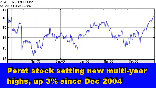 As of Sep 30, the sold-out positions outpaced the new positions acquired by the institutional shareholders by 24 million shares to 9 million shares. Sellers outnumbered the buyers by 247 to 128 during the third quarter. As a result, institutional shareholdings now hold only 64% of the total shares outstanding, versus 90% two years ago. Correspondingly, the insiders' ownership rose from 8% in Dec 2004, to 13% now. And that's when the ACS shares were relatively stable. The stock lost most of the 22% value drop in 2006 between March and June (see above chart). ACS shares are down 16% since two years ago. ACS said on Nov 27 that its internal investigation concluded that "certain conduct" of CEO Mark King and CFO Warren Edwards "violated the company's code of ethics for senior financial officers." The investigation was initiated in response to an informal inquiry by the SEC, and a subpoena from a grand jury in the Southern District of New York, the company said. The probe reviewed ACS's stock option practices from 1994 through 2005. More than 150 companies, including CSC, for example, have launched internal investigations or are the subject of probes by the SEC to determine if the dates of stock options were manipulated, according to a Nov 27 AP story. Perot Systems Shares at New Multi-year Highs Perot Systems shares are setting new multi-year highs. At $16.10, they are up 3% from the price two years ago, which was also a multi-year high. For the smallest company among the top 8 IT services firms that we have been analyzing, Perot's stock has been a model of stability (see Top 9 chart).