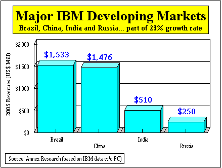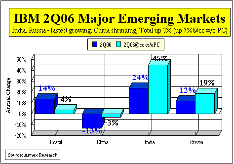 Major emerging markets continue to be sources of strength in IBM financial results. Three of the four reported double-digit growth, with India and Russia leading the way. The only decline was in China, but that's compared to a quarter a year ago in which IBM closed some major banking deals in that country.
