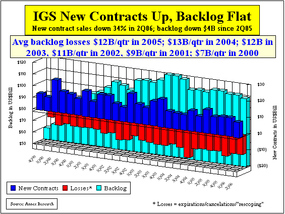 The absence of major disappointments, however, did not mean that IBM had a great quarter. On the contrary. Big Blue's results were at best mixed. But top and bottom lines did hit the Wall Street expectations on the button. Revenues were $21.9 billion, down 2% as reported (up 1% adjusted for currency fluctuations and sales of the PC unit). Earnings were $2 billion, up 9% from a year ago (up 11% from continuing operations). Business Segment Analysis Global Services. IBM's largest business segment was also the biggest disappointment in the quarter. IBM Global Services (IGS) revenues declined again by 1% to $11.9 billion. More worrisome, however, was a precipitous 34% drop in new contract signings to $9.6 billion, and the corresponding $2 billion sequential decline in the backlog. Since a year ago, however, the IGS backlog is down $4 billion. It is $9 billion lower than in the second quarter of 2004.
