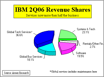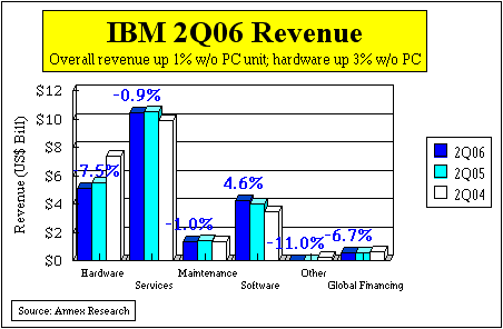 Clearly, IGS' anemic results indicate long-term problems that the reorganization from one year ago has failed to fix. And what are its problems? In a word, it is its size. The unit is simply too big for its own good. Nothing new there, of course, for Annex clients and readers. We have been saying since 1996 that Big Blue should consider splitting it up. Well, now that's even more evident than ever. And how should IGS be broken up? The most logical way to us would be to create a number of semi-autonomous industry units. This should speed up decision making, and make gigantic operation more nimble, and thus more competitive. But while IGS is having a hard time growing, there are a number of other things this IBM unit is doing right. It is increasing the share of smaller and more profitable deals in its portfolio. And it is lowering its costs by its Indian offshoring strategy. As a result, the IGS gross margin jumped from 26.1% a year ago to 27.7% in the latest period. We see this as another piece of evidence that IBM is now putting quality ahead of quantity (also see "IBM vs. HP: A Tale of Two Blues," June 2006). Hardware. IBM second quarter hardware results were mixed. A seven percent jump in mainframe revenues was a positive surprise. So was a 45% surge in Microelectronics business. But revenue shortfalls caused by operational problems in System i and System x server product lines were unexpected disappointments. "Our unusually high level of unfilled orders were due to end-to-end supply chain complexities which were primarily driven by parts and product transitions to support the RoHS (Removal of Hazardous Materials) requirement in Europe," explained Mark Loughridge, the CFO, in a post-earnings teleconference with analysts. This meant that a number of System i and System x orders were not fulfilled. Without this problem, the System i revenue would have been flat, and System x revenue would have risen by about six percent. The 10% drop in System p revenues, brought about by technology transition, was less surprising, especially as it compares to one of its best quarters ever (last year's 2Q). Despite these problems, IBM hardware revenues grew by 3% to $5 billion, thus continuing to be a bulwark of the company's recovery.