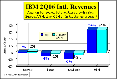 Geographies. That was evidently no small feat as IBM's overall geographic results were pretty anemic. The America's region grew by 1% since a year ago, but Europe and Asia/Pacific were both down (4% and 9% respectively). It was the OEM sector that produced the best results, rising 34% in the period.
