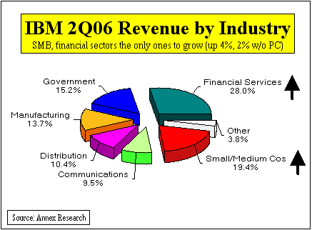 Meanwhile, Brazil, the largest of the four IBM operations, had a 14% jump in the quarter as reported, or 4% when adjusted for currency. Industries. Small and medium business (SMB) and financial services were the best IBM industry sectors in the second quarter. Their revenues rose 4% and 2% respectively. The rest of the sectors declined.