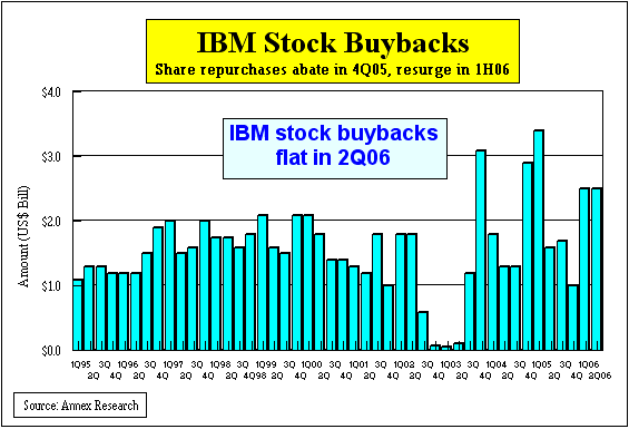 Outlook Loughridge acknowledged disappointment in services contract signings. But he was encouraged about the future demand. "Clearly there's enough opportunity,'' he said of the services' sales outlook. "We just need to get it signed.'' The IBM CFO admitted that the services and hardware divisions "didn't perform to our expectation" in the quarter. But he hailed the software results as a good example of IBM's multi-dimensional portfolio. When one side of the business underperforms, another is there to pick up the slack. "The strength and breadth of the IBM model comes from being able to leverage across these two dimensions," he said. It is for that reason that Loughridge confirmed his and IBM's belief that the company would be able to deliver the 2006 results in line with Wall Street's expectations. Which means revenues of about $90 billion, and EPS of about $6. So stand by for additional stock price hikes tomorrow, as broader markets digest and act upon this news.