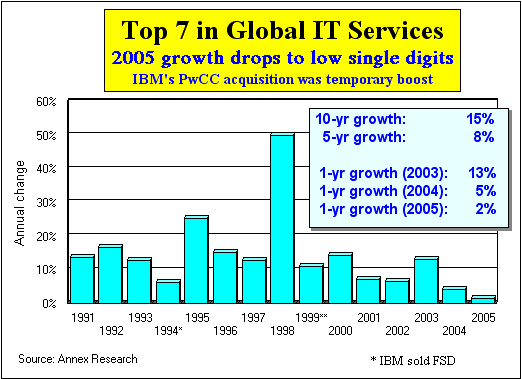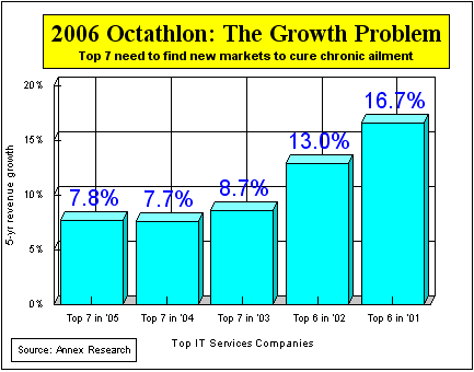 In 2005, for example, the average revenue growth rate of the Top 7 competitors dropped to just 2.5%.  Yet only two years ago, it was 12.7% (mostly thanks to IBM's PwCC acquisition, not indigenous growth).  Two competitors actually shrank in size (EDS and Fujitsu).  Only two companies reported double digit growth (Accenture and HPS).
