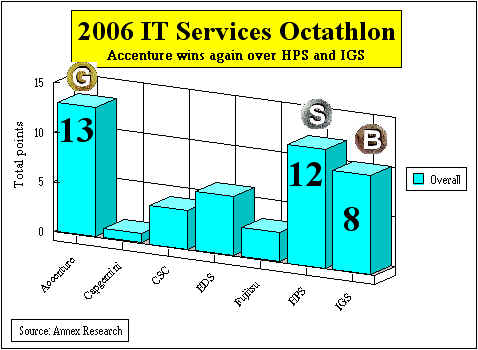 SCOTTSDALE, Apr 24 - Accenture won the “gold” in our 2006 annual global IT services Octathlon for a second year in a row, its fifth outright title to go with two ties for the "gold" in the last 11 years.   Hewlett Packard Services (HPS) and IBM Global Services (IGS) got the “silver" and the "bronze" respectively.  This year, however, Accenture's margin of victory was narrower (13 vs. 12 points for HPS and eight for IGS).