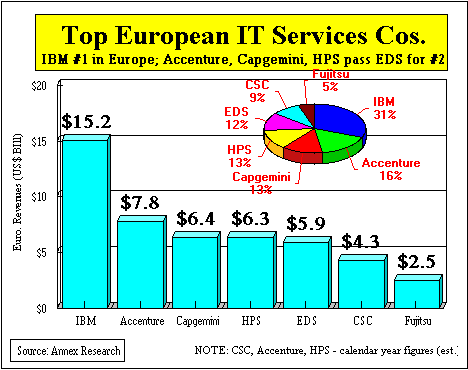 In Europe, Accenture, HP and CSC were the big gainers, Capgemini treaded water, while the rest lost share.  In 2004, Capgemini and Accenture surpassed EDS, dropping the former “Euro star” to the fourth place.  But this may change now that EDS has won the big British defense contract.