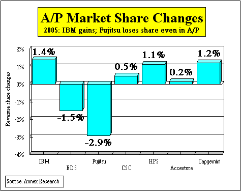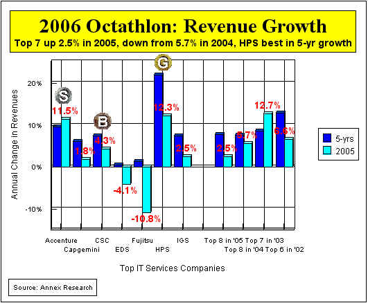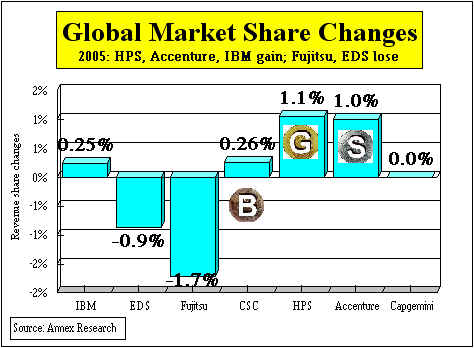 The “gold” medal for the best revenue growth in 2005 went to HPS (up 12.3% over 2004).  Accenture won the “silver” with a 11.5% jump, while CSC earned the “bronze” with a 4% increase.  Meanwhile, two the Top 7 competitors experienced revenue declines last year (EDS and Fujitsu, the latter mostly due to foreign currency translations - the weakness of the yen against the U.S. dollar).