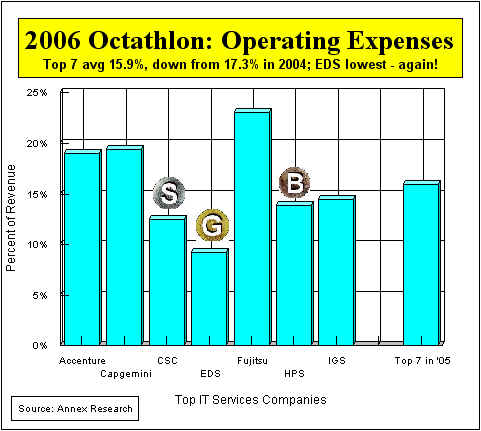 Just as Accenture seems to be pre-subscribed to profitability medals, EDS has been a perennial winner of the frugality competitions.  One of the most beleaguered competitors in the last two years, EDS still continued its unfettered grip on the “gold” for the lowest operating expenses.  At 9.2% of revenues (down from 9.8% the year before), EDS’ 2005 operating expenses were by far the lowest among the Top 7 competitors.