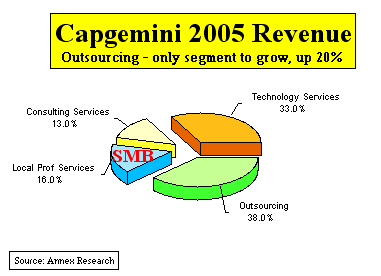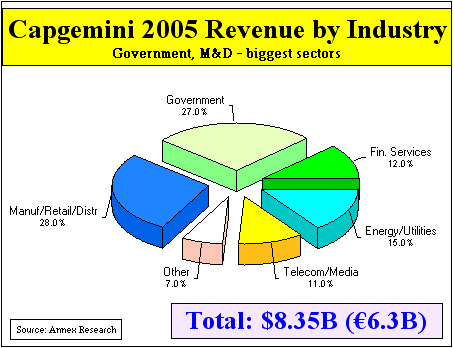 Among the industry sectors, manufacturing and distribution and government led all others, accounting for 55% of the total revenues. Energy and utilities. financial services and the telecoms were the next three largest segments. Outlook Hermelin, the CEO, said he expected the IT services market to grow in the mid-single digit range in 2006. Capgemini should outgrow the market, he opined, forecasting a 6% to 7% increase in its revenues. These are modest ambitions for a company