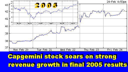 Analysis of Capgemini's 2005 Business Results Capgemini Tops Rivals Strong Finish to a Great Year; Revenues Up 12% (15% in Constant Currency) MOSCOW, Feb 25 - Capgemini finished 2005 with a bang. Revenues surged by 11.5% (up 15% at constant currency) to €6,954 million ($8,345 million). More importantly, the company reported a €225 million operating profit, as compared to a €24 million operating loss in 2004. Net profit was €141 million compared to a €534 million loss the year earlier. Last but not least, net cash rose from €285 million to €904 million, and the company declared a €0.5 per share dividend. "I