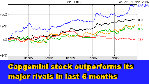 think it was a year of solid progress, since for the first time we Investors also applauded the final 2005 results by bidding the Capgemini share to multi-year highs. As a result, the rise of Capgemini stock topped all of its major rivals' shares in the last six months, including that of the highflying IT companies, such as HP and Accenture (see above chart). It closed Thursday (Mar 2) at €42.43, just off its 52-week high of €43.22. Wall Street analysts rushed to upgrade the stock, as usual after the stock had already risen. S&P revised its outlook on Capgemini from negative to stable, saying the credit rating agency expected that, “Capgemini’s operating performance will continue to gradually improve, in line with recent trends.” Goldman