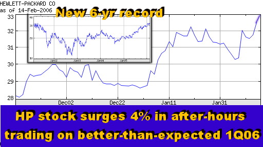 Analysis of Hewlett-Packard's First Quarter FY06 Results Recovery Continues HP Reports Another Solid Quarter on Its Road to Recovery SCOTTSDALE, Feb 15 - Hewlett-Packard (HP) reported another solid quarter after the markets closed today, sending the stock up nearly four points in after-hours trading to new six-year highs. Earlier today, HP shares declined 2.5 points in regular trading ahead of its first quarter fiscal year 2006 earnings release. But the actual results showed that the recovery under the leadership of Mark Hurd, who took over as HP CEO last April, is clearly continuing unabated. The main reason for the upsurge in the HP stock price was a better-than-expected EPS number (48 cents per share vs. 44 cents per share Wall Street analysts had forecast). That is a 30% jump from the corresponding quarter a year ago, Carly Fiorina's last. "Which means we are on track, and the results are showing up both in our top line and in our margins," said Mark Hurd, HP's CEO, in a post-release teleconference with analysts. "However, we know we have more work to do, and we know we can do better," he added. Business Segment Analysis Geographies. Worldwide revenues were up 6% (up 8% in constant currency), with North America leading the world with a 10% increase to $9.7 billion. Asia/Pacific also showed respectable growth (up 6% to $3.5 billion), while Europe grew only 1% to $9.4 billion. Sequentially, however, Europe was the only region to grow in the last two quarters, with Eastern Europe leading the way, while Western Europe continued to be sluggish. But it was the "emerging markets" that showed the best growth. "China and India were exceptionally strong," said Hurd. "China is no longer an 'emerging market'; it has emerged," he added with a great deal of emphasis on the last verb. Foreign currency translations wiped out between two and three points of the growth. It is a trend that the company's CFO, Bob Wayman, expects to continue in the near future, such as in the current quarter. In summary, however, Hurd characterized the overall global demand as "pretty steady." Product Lines. Among the HP product lines, the Imaging and Printing Group, which accounts for the biggest share of the company's overall earnings, reported an 8% increase in revenues (to $6.5 billion). Operating profit rose from $932 million to $973 million, a 14.9% margin. By contrast, rival Lexmark last month posted a 47% drop in profit, hurt by tough price competition. Revenue in HP's PC group also rose 8% from the year-earlier quarter to $7.4 billion, as unit shipments of PCs and notebooks climbed 16%. Just as important for HP shareholders, the PC operating margins jumped from 2.1% a year ago to 3.9%. In the Enterprise Storage and Servers Group, revenue increased 5% to $4.2 billion. Operating profit was $326 million, a 7.7% margin, up from 1.7% a year ago. The only HP product line to show a decline in revenue was HP Services. Revenues dropped 2% to $3.8 billion, although they rose 3% in constant currency. Hurd explained the decline the unit was focusing on improving its profitability. Indeed, operating margins rose from 7.4% to 7.8%. Hurd said his goal was to see the HPS operating margins closer to 10% in the future on a 4% to 6% revenue growth. Outlook So things are evidently improving across the HP product lines and in most geographies. Looking ahead, the company expects full fiscal year 2006 revenues to be in the $90 billion to $91 billion range, with net earnings of $1.90 to $1.95 per share. Which is higher than the $1.83 per share average that Wall Street expected prior to today's release. The turnaround is evidently continuing, and with it, the HP stock keeps moving up.Happy bargain hunting! Bob Djurdjevic Click here