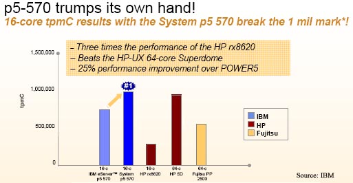 A 16-core System p5 570 with 2.2 GHz POWER 5+ outperformed a 64-core HP Superdome with Itanium2, IBM said (see the chart). And it bettered its own prior performance of a POWER5-driven 570 server by 25%. Results such as these put the pSeries on top for the full year growth among all IBM servers (up 14% in 2005), as you saw in our "IBM: Smaller Is Better" (Jan 2006) report on IBM's fourth quarter results.