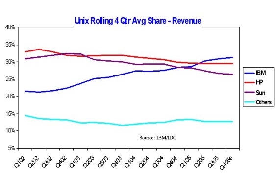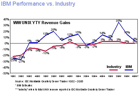 In an industry segment (Unix) that's been basically flat-lining, the pSeries has managed eke out a double digit growth. Which means that 2005 will have been the fourth consecutive year of revenue market share gains for the IBM Unix servers (see the above chart). "We've enjoyed very impressive growth, especially in the small and medium business segment," said Freund. And since SMB is key to IBM's overall growth, that means the the pSeries is an important contributor to Big Blue's strategic objectives. The key to such success has been the "i" word - innovation. When the industry was struggling to extend its performance range with traditional chips, IBM's pSeries developers came up with the "dual core" concept. Now that the competitors are starting to creep up with their own dual core technology, IBM is pioneering with the "quad core" approach. Which is setting a new high water mark for the competitors to try to reach. The p5-550Q model, for example, has been "phenomenally successful" in its first quarter of shipments (4Q05), IBM said. "We anticipate a lot of demand for these quad core models," Freund said. That's how a winning game is played in technology businesses... faster, denser, cheaper = better. We have a feeling the customers' fingers may be doing the walking to those check books as we write this. Happy bargain hunting! Bob Djurdjevic Click here
