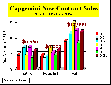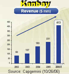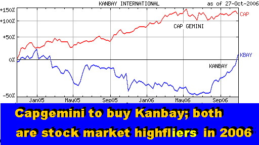 Analysis of Capgemini's Preliminary Third Quarter Business Results By Leaps and Bounds Capgemini to Buy Kanbay; Deal to Boost Its Financial Services, North American Business SCOTTSDALE, Oct 27 - Capgemini is growing by leaps and bounds. Its organic revenue growth in the third quarter was 13.5%, according to the just-released preliminary results. And the company has announced another major acquisition that will boost its position in the financial services sector and in the North American market. Capgemini is buying Kanbay, a $400-million+ Chicago-based IT services vendor, for about $1.25 billion in a cash transaction. Kanbay, with its 6,900 employees (5,000 of which are in India), will help increase Capgemini's financial services sector revenues by 25%, and its North American total by 45%. "Capgemini's strategy is now to grow and expand, after the turnaround period," said Pierre-Yves Cros, the company's strategy director, in a post-earnings teleconference with analysts. "This is a deal which is perfect from a strategy standpoint. It is a deal driven by growth and new market conquest." Meanwhile, Capgemini's third quarter new contract bookings grew to 1.5 billion euros, a jump of nearly 20% over the same quarter 2005. They were especially strong in outsourcing, but were also up by 17% for technology integration, local professional and consulting services. Europe and Asia Pacific were the best geographic regions, reporting a 15% revenue growth, with the UK & Ireland rising the fastest (29%). Central Europe, Spain and Portugal also posted double-digit growth. The North American revenues rose by 5.4%. The company is expected to announce its full third quarter results on November 9 (and it did... see above charts). Kanbay Acquisition Seen as Positive Kanbay, Capgemini's latest acq After about a 15 month- declining trend that started around January 2005, the Kanbay shares have risen sharply in the last three months (see the chart). The $29-per share price that Capgemini is paying for Kanbay (about $1.25 billion or 1 billion euros) represents a 16% premium over Kanbay's recent price, or a 28% premium over last month's average trading price. Kanbay shares have outperformed those of its buyer in the short term, but are lagging behind over the last two years, during which Capgemini became one of the industry highfliers. Capgemini's CEO, Paul Hermelin hailed the acquisition in a statement, “we believe this is a landmark transaction in the global IT services industry. This event can fundamentally transform the professional services industry by enabling efficient global services delivery via an integrated single point solution delivered in a seamless fashion resulting in a lower total cost of ownership for the client.” After the acquisition is completed in early 2007, Capgemini will have about 12,000 employees in India. This will put in on a 31% compound annual growth track to reach 35,000 employees by 2010. Kanbay's clients are located in North America, India, Asia-Pacific, and Europe. The company was founded in 1989 by Raymond J. Spencer, the current CEO, Dileep Nath, and John Patterson. The company is headquartered in Rosemont, Illinois with offices in North America and India, as well as in London, Singapore, Hong Kong, Tokyo, and Melbourne. Summary and Outlook The Kanbay acquisition is expected to have a positive