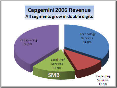 horizontal segments in 2006. They were up 25% and 11% respectively, Consulting services' profit margins improved by five points in 2006, while those in Technology services rose by more than two points. Outsourcing also saw a three-point rise in its operating margins despite the extra costs related to the Schneider megadeal. Finally, Local Professional services (Sogeti) also improved its profitability by almost a point to 9.8%, putting it on a par with consulting, the company's most profitable activity with 10.1% operating margins. CEO Hermelin warned that Capgemini expects the pace of growth in its IT outsourcing operations to slow this year as it approaches the end of some major contracts. But he was hopeful, however, to offset that with the company's $1.25 billion acquisition late last year of Kanbay which specializes in IT services for banks (see "By Leaps and Bounds," Oct 2006). "Kanbay takes us into areas of business where we