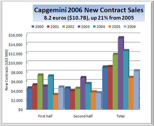 But the 2006 total is still lower than the signings in the earlier five years (2000-2004, see the chart). Which means that Capgemini needs to crank up its sales performance this year if it is to maintain its double digit revenue growth momentum. Outlook And that doesn't appear very likely, even by the company's own projections. Capgemini said it expected revenue growth of 8% in 2007 (at constant currency), well below the 12% rate the company has just reported. Which would still be on the high side of the average industry growth rates.