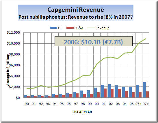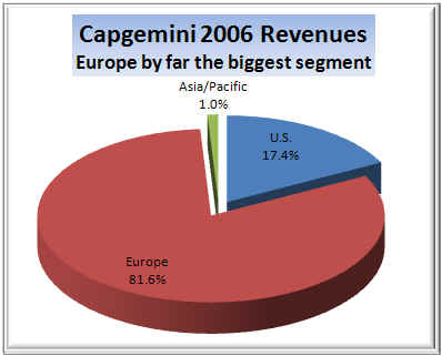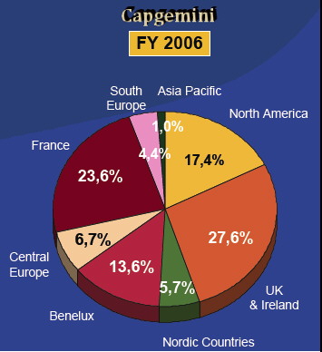 Updated 2/15/07, 11:30AM MSTAnalysis of Capgemini's Fourth Quarter Business ResultsCapgemini Caps Great Year, Saves Best for Last Revenue Grows in Double Digits; Net Profit DoublesSCOTTSDALE, Feb 15 - Capgemini saved its best for last. The company capped a great year with an excellent fourth quarter. Revenues surged by double digits (up 13% as reported, up 14% in constant currency), led by strong growth especially in Asia/Pacific, U.K./Ireland and German markets. For the full year 2006, revenues were up 11% as reported (or 12% in constant currency) to €7.7 billion ($10.1 billion). And the results were even more impressive in U.S. dollar terms, given the decline of the U.S. currency against the euro in the last 12 months. The 2006 revenues were up 21% in U.S. dollars over the year before. Net income for the year more than doubled, from €141 million in 2005 to €293 million ($384 million), beating the stock market estimates. Analysts had forecast full-year net profit of €283 million. Capgemini generated operating cash flow of €578 million ($757 million) in 2006, and raised its dividend by 40%. The company's operating margins also surged from 3.2% in 2005 to 5.8% last year. And the improvements are likely to continue. Capgemini CEO Paul Hermelin said today during the analyst call that he expected the operating margins to grow to 7% this year, and then to 8.5% in 2008, as the company extends its recovery that started in 2004. No wonder the Paris Bourse stock traders liked what they saw, pushing the Capgemini shares up by more than four points to a new multi-year high by mid-day today (Feb 15 - see the chart). Business Segment Analysis Geographies.
