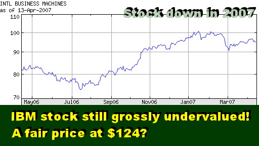 Updated 4/16/07, 4:30PM PDTA Preview of IBM First Quarter Business ResultsIBM Stock Still Grossly Undervalued Priced at Peer P/E Ratios, IBM Should Be Worth $124?SCOTTSDALE, Apr 16 - IBM stock is inching up toward its closing price of 2006 ($97), but it is still down for the year and is grossly undervalued relative to its peers. Our latest analysis, done on the eve of Big Blue's first quarter results, basically confirmed what we said nearly five months ago. IBM stock should be worth $124 if priced at peer P/E ratios. We said as much in late November when we also took the market temperatures of IBM and its five peer competitors (see "A $125 Stock," Nov 2006, and "Grossly Undervalued," July 2006). And how did we arrive at such conclusion? By analyzing the business fundamentals and market data of IBM, HP, Fujitsu, EDS and Capgemini - three conglomerates and two global services competitors.
