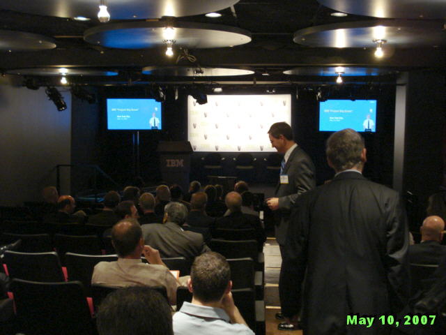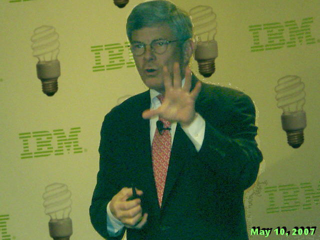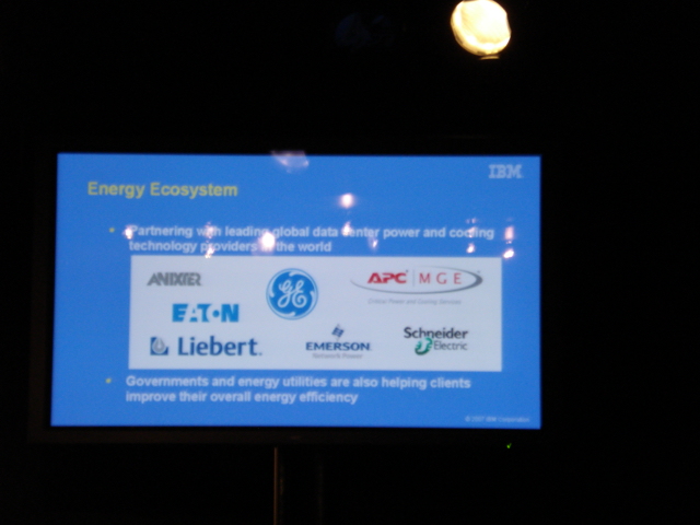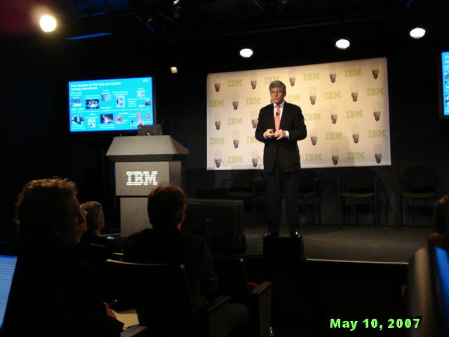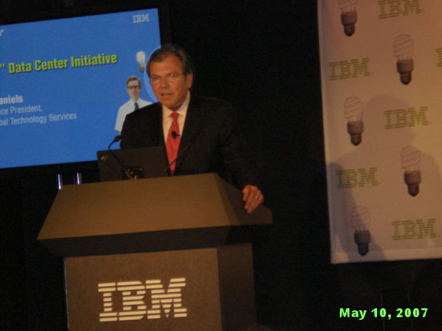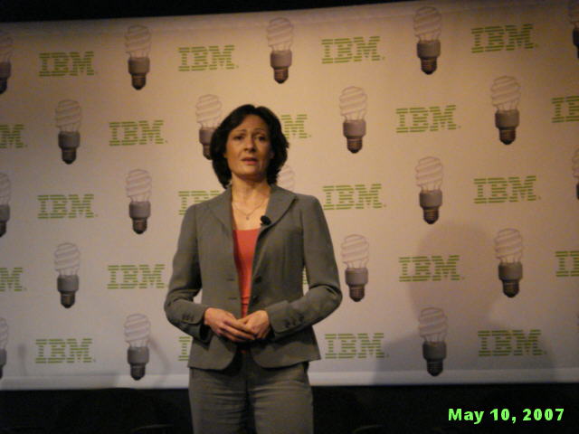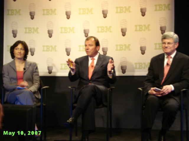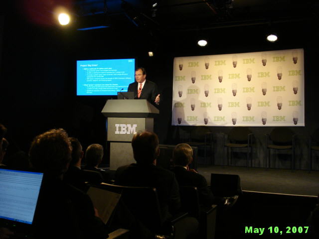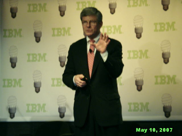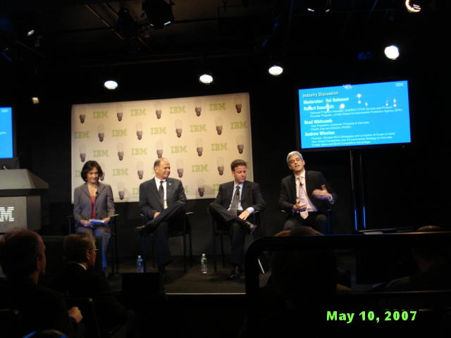 How startlingly green is that? Wow, you might say, isn't IBM being altruistic! It is and it isn't. The best part about IBM's Project Big Green is that it not only good for the environment; it is also good for business. And it is the latter motive that gives the idea real traction. Big Blue stands to save a lot of money from greening its own datacenters, and to make a lot of money from selling its "green solutions" to its customers. This point has not been lost on Wall Street today. Big Blue (...oops, Green) shares are up to a new five-year high of $104.85 as we write this, even though the Dow Jones index, of which IBM is a part, is down more than 130 points. EPA's Sauchelli also pointed that the Energy Star members have higher stock market prices than the market as a whole. How's that for turning a cool idea hot - with EPA cheering it all the way! :-) Speaking of cheering, this IBM press conference was the first one this writer ever attended at which the normally blasé reporters applauded before and after the show. A Photo Gallery from IBM Press Conference