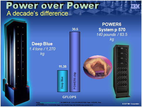 defeated the chess world champion Kasparov only 10 years Now, that's Power over Power, isn't it? It's also IBM leapfrogging itself on the Unix power performance curve - another first in the industry that has often seen competitors leapfrogging over each other. Okay, okay... we know, these are all nerdy facts and figures that few business executives lose much sleep over. But how about this: Can you imagine getting all this power at half the power consumption? Now we are talking, right? We're talking "green" (i.e., environmentally friendly technology). And talking "green" is cool thing these days. The Power6 chip that IBM unveiled today is its first truly "green" product. Bernie Meyerson, chief technologist of IBM's Systems and Technology Group, told the media today that the chip is the first product delivered under the company's energy efficiency initiative announced earlier this month, designed to make corporate computing centers more environmentally friendly (see "The Greening of Big Blue," May 2007). Besides the obvious data processing gains, "this