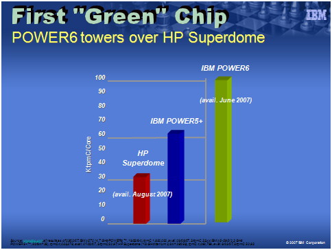 Meyerson said. So a System p customer can get all that souped-up power AND get to FEEL good about it. That's a lot more than any NASCAR or Formula 1 champ can say. No wonder Big Blue marketing folks chose the green color for the new chip's logo and charts (left thumbnail). The Power6 chip doubles the performance the previous